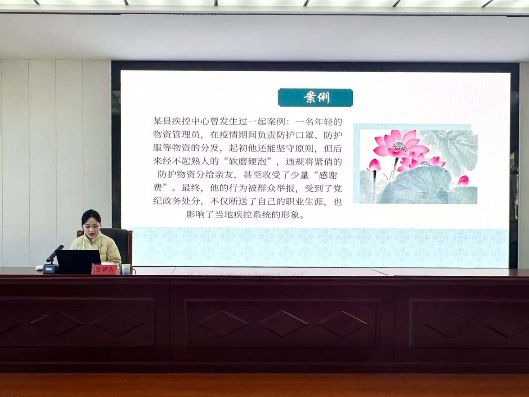 夏玉茹围绕“扣好年轻干部廉洁从政‘第一粒扣子’”的主题,结合疾控监督工作实际,从“守纪律讲规矩、筑牢廉洁底色”“守底线存敬畏、严守自律关口”“严管厚爱并举、锤炼干净队伍”三个方面详细讲解,通过系统内多起典型案例,教育引导干部职工筑牢思想防线、严守纪律规矩、涵养清廉作风,以廉洁之姿守护人民健康。