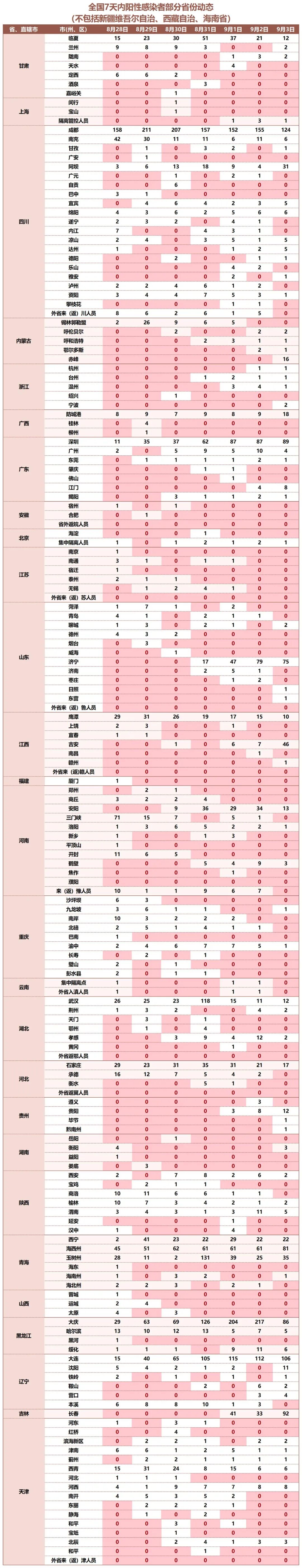 9月3日0-24时,31个省(自治区、直辖市)和新疆生产建设兵团报告新增新冠肺炎本土确诊病例314例(四川98例,广东79例,西藏51例,海南24例,辽宁11例,吉林11例,内蒙古10例,青海8例,黑龙江4例,天津3例,贵州3例,河北2例,浙江2例,江西2例,北京1例,上海1例,山东1例,湖南1例,重庆1例,陕西1例),含40例由无症状感染者转为确诊病例(海南16例,四川7例,西藏6例,吉林4例,青海4例,北京1例,黑龙江1例,浙江1例)。