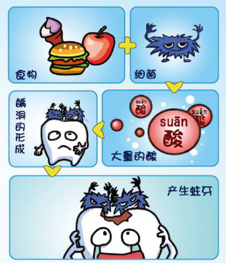 我们的口腔里住着许多看不见的“小坏蛋”——细菌。当我们吃完东西后,食物残渣会黏在牙齿上,细菌就会把这些残渣变成酸,酸会像小虫子一样偷偷腐蚀牙齿,形成蛀牙(龋齿)。如果不好好清洁,细菌还会让牙龈红肿出血,这就是牙龈炎啦!