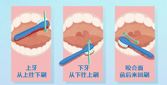 每天早晚各刷一次牙,每次至少2分钟。推荐使用“巴氏刷牙法”(小范围水平震颤刷牙龈和牙齿交界处,牙刷与牙齿呈45度角,上牙从上往下刷,下牙从下往上刷,咬合面,来回刷,每个面都要刷到哦!)。