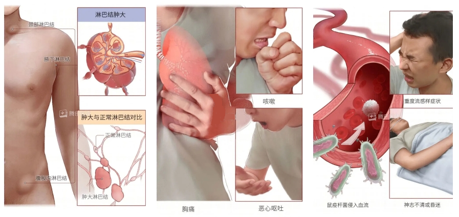1.腺鼠疫:特征为发烧、局部淋巴结(如腹股沟、腋下)肿大、疼痛,形成“鼠疫结节”,是鼠疫最常见的类型。
