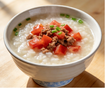一碗就能吃到肉、菜、饭的全部营养。首先,番茄中的维生素C能促进牛肉中铁的转化与吸收;其次,番茄红素是脂溶性营养素,牛肉中的脂肪有助于其释放和吸收;最后,大米粥提供了温和的碳水化合物,粥底暖胃又好消化。
