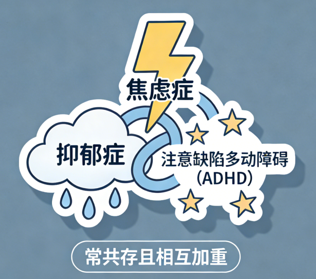 ◆ 共病:常与抑郁症、焦虑症、注意缺陷多动障碍(ADHD) 共存,相互加重。