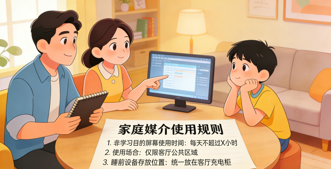 2.共同制定规则:与孩子平等协商,制定清晰的“家庭媒介使用规则”,包括非学习目的屏幕使用时间、场合(如就餐不用手机)、睡前设备存放位置等,并全家一致执行。