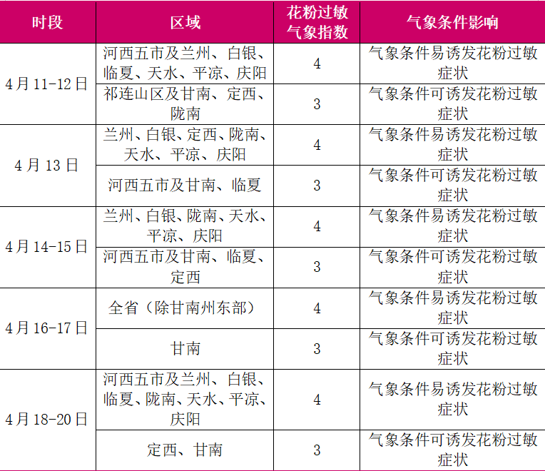 甘肃省气象服务中心、甘肃省疾控中心2026年04月10日联合发布4月中旬甘肃省花粉过敏气象指数预报:预计4月中旬,我省除甘南州外,大部分地方最高气温在15℃~25℃之间,气象条件有利于木本及草本植物花粉种类和数量的增多,大部分地方的花粉过敏气象指数为4级,气象条件易诱发花粉过敏症状。但在11-12日祁连山区及甘肃南部,13日河西五市、甘南、临夏两州市,14-15日全省大部分地方及18-20日甘肃南部部分地方有降水,空气中相对湿度浓度增高对花粉的传播起到一定的抑制作用,花粉过敏气象指数为3级,气象条件可诱发花粉过敏症状。春季是花粉过敏的季节,建议过敏人群关注花粉相关预报,在晴朗、干燥、有风的天气,尽量减少户外活动。出门佩戴密封性好的防护口罩和护目镜,能有效阻挡花粉进入口鼻和眼睛。回家后立即更换外衣,并清洗面部、鼻腔,有条件的可以使用生理盐水洗鼻。有明确过敏史的人群,可在医生指导下,启动预防性用药,过敏性哮喘患者需提前准备急救吸入剂,避免严重发作。出现较严重的过敏症状应及时就医,进行规范治疗。