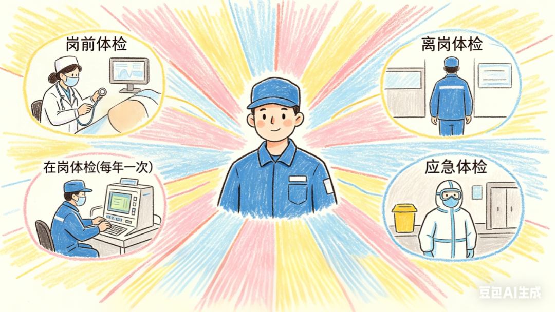 体检包括岗前、在岗(每年一次)、离岗和应急体检。