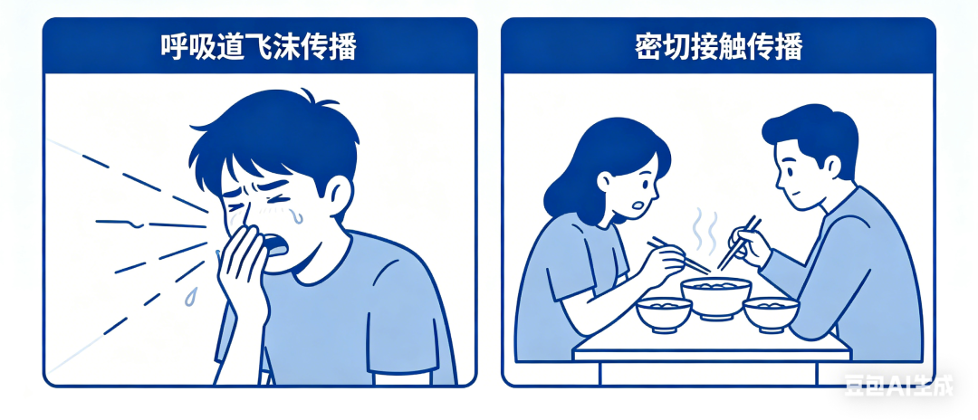 传播途径:以呼吸道飞沫传播和近距离密切接触为主,日常咳嗽、打喷嚏、亲吻、共用餐饮器具等行为均可能造成传播。