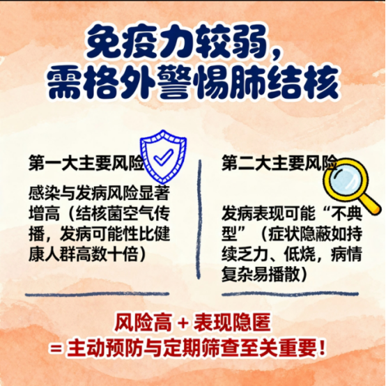风险更高,表现可能不同。对您而言,肺结核的风险主要来自两方面: