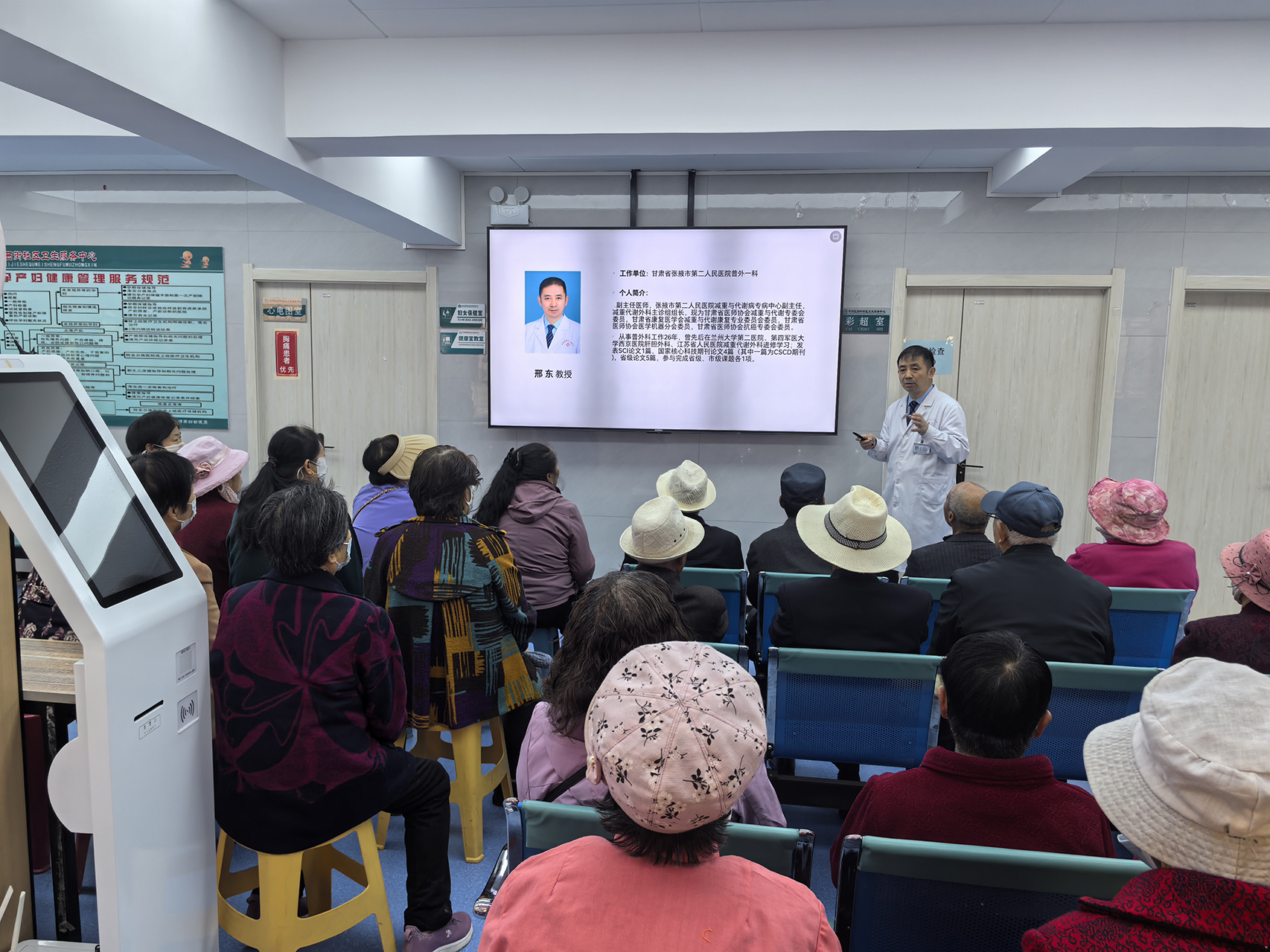 活动现场秩序井然、氛围热烈。本次讲座特别邀请张掖市第二人民医院邢东主任为居民授课,吸引了120余名群众到场聆听。邢主任结合多年临床经验和真实病例,用通俗易懂、接地气的语言,围绕癌症预防、筛查重点、规范治疗以及高危人群早发现、早诊断、早治疗等内容细致讲解,耐心回应居民关心的健康问题,帮助大家走出防癌误区,树立科学理性的抗癌观念。为让宣传更实在、服务更暖心,现场还专门设置了健康咨询台,疾控中心和社区卫生服务中心的工作人员面对面为居民答疑解惑,免费为大家测量血压、血糖,用细心服务守护居民健康。