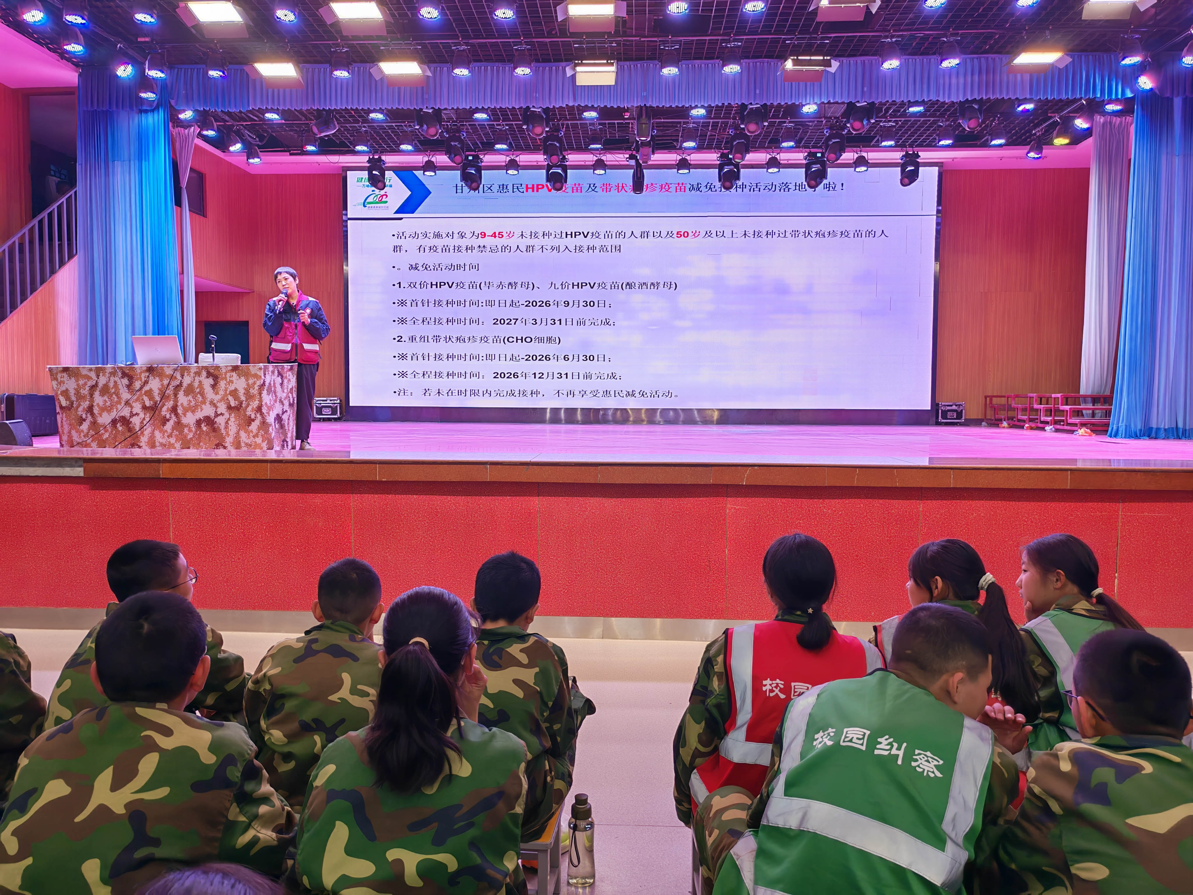 宣讲现场暖意融融、氛围浓厚,授课人员结合春夏季节传染病发病特点,采用通俗的语言和鲜活的案例,详细解读了春夏交替时节常见传染病的传播途径、典型症状及科学预防方法,引导同学们养成良好个人卫生习惯,提醒大家牢牢守住“勤洗手、戴口罩、常通风、少聚集、讲卫生”十五字防护底线,叮嘱大家一旦出现发热、咳嗽、呕吐、腹泻、皮疹等不适,需第一时间告知老师和家长,及时就医,做到早发现、早报告、早治疗。同时针对刚刚纳入国家免疫规划程序的HPV疫苗接种知识进行了细致讲解,动员2011年11月10日之后出生的年满13周岁的女童积极响应国家政策,及时接种HPV疫苗,守护好自身健康。