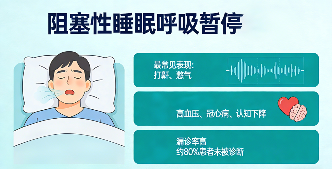 以阻塞性睡眠呼吸暂停最为常见,表现为打鼾、憋气,与高血压、冠心病、认知下降密切相关,漏诊率高。
