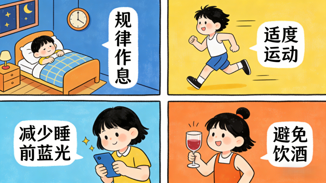 4.生活方式干预。规律作息、适度运动、减少睡前蓝光、避免饮酒,这些习惯有科学依据,能有效改善睡眠。