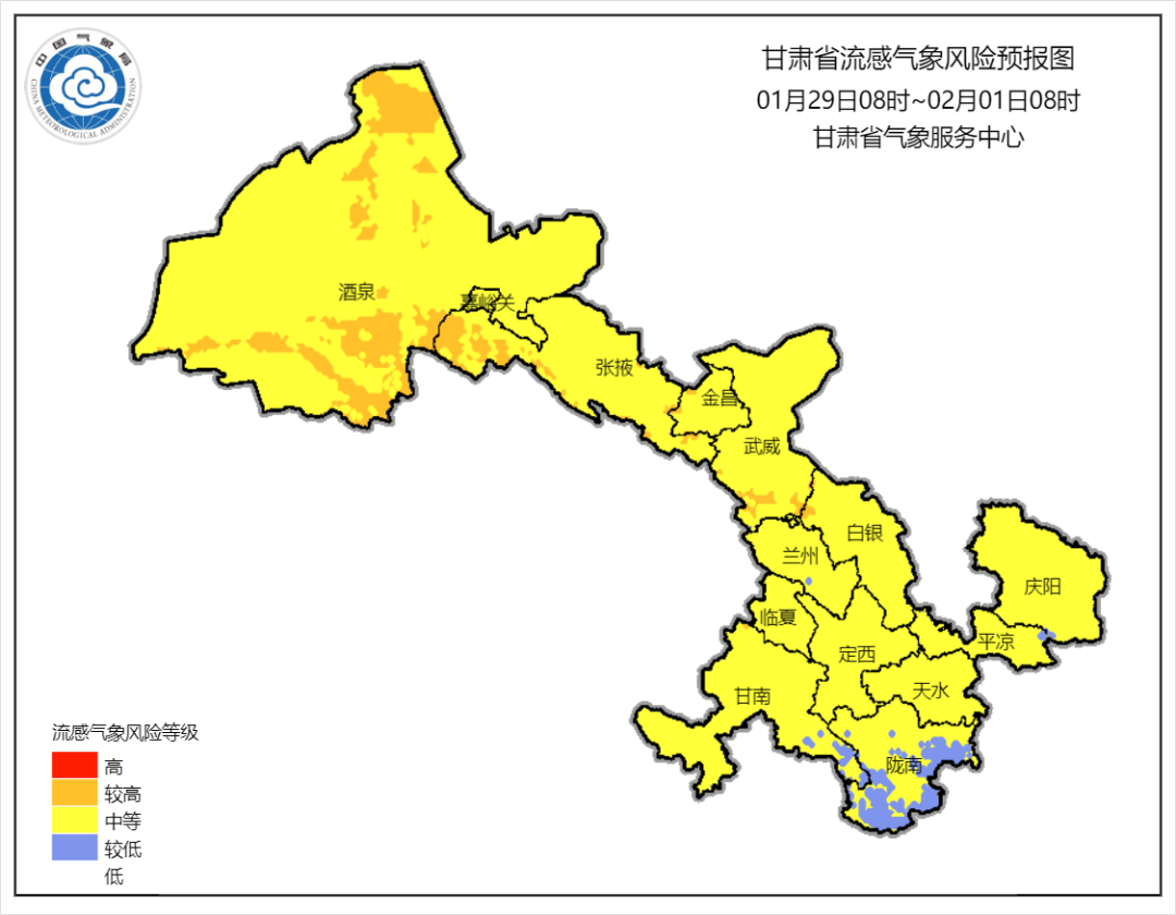 甘肃省气象服务中心、甘肃省疾控中心于2026年01月27日16时联合发布甘肃省流感气象风险提示:受较强冷空气影响,结合传染病流行规律,预计1月29日~2月1日清晨,全省大部流感气象风险等级为中等,其中酒泉(肃北、瓜州、阿克塞)、张掖(肃南、民乐)、武威(天祝)等地流感气象风险等级较高。提醒大家务必注意增添衣物,保持室内空气流通,保持良好的个人卫生习惯,同时在人员密集场所记得佩戴好口罩,加强个人防护,尽量降低呼吸道传染病的发生风险。