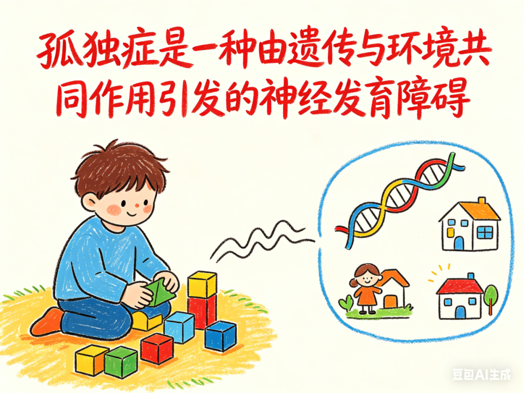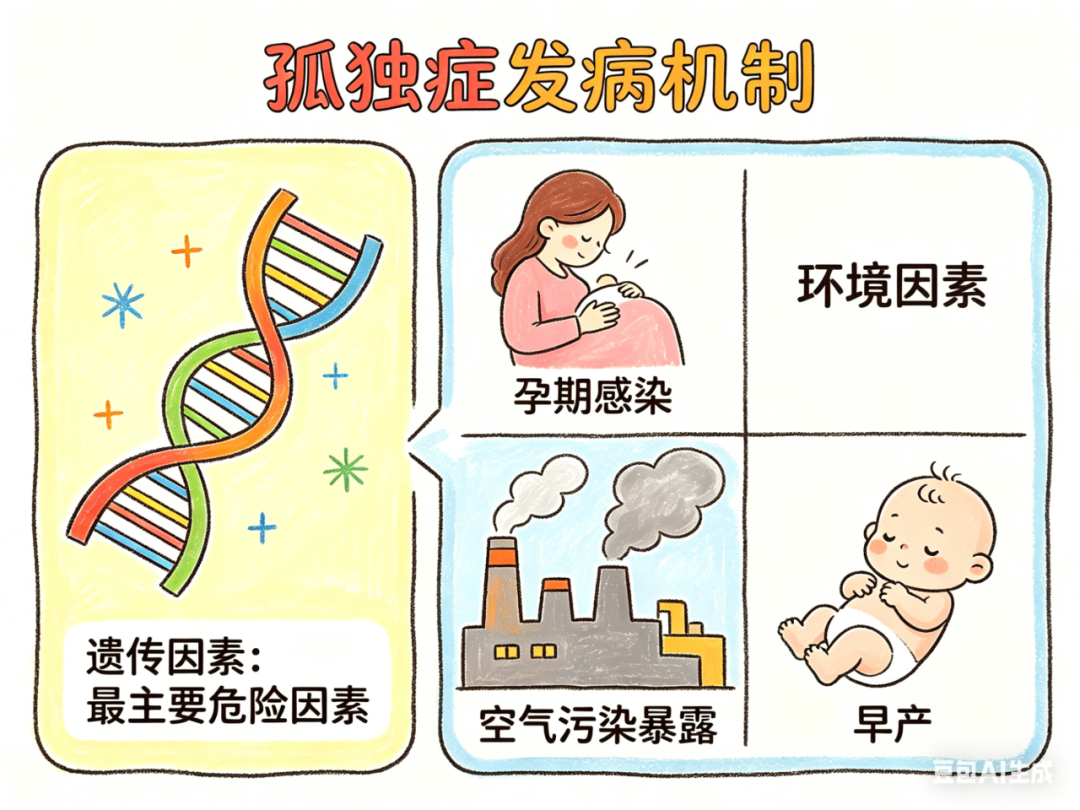 孤独症的发病机制尚未完全明确,但目前研究认为,遗传因素是最主要的危险因素,遗传度达74%~93%,与100多个基因位点相关。环境因素如孕期感染、空气污染暴露、早产、低出生体重等,也可能通过影响早期大脑发育增加发病风险。
