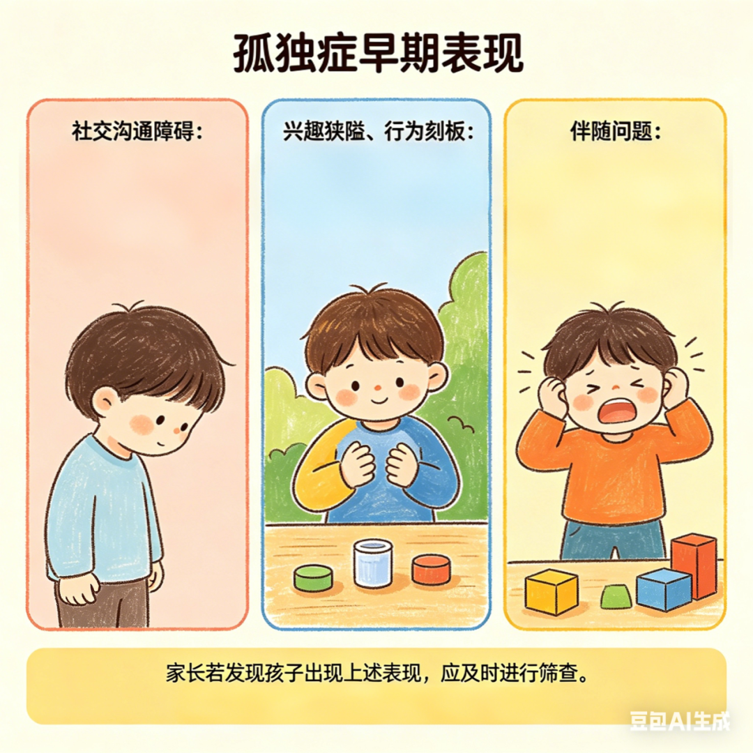 孤独症的核心表现集中在社交沟通与行为模式两方面,早期表现主要包括: